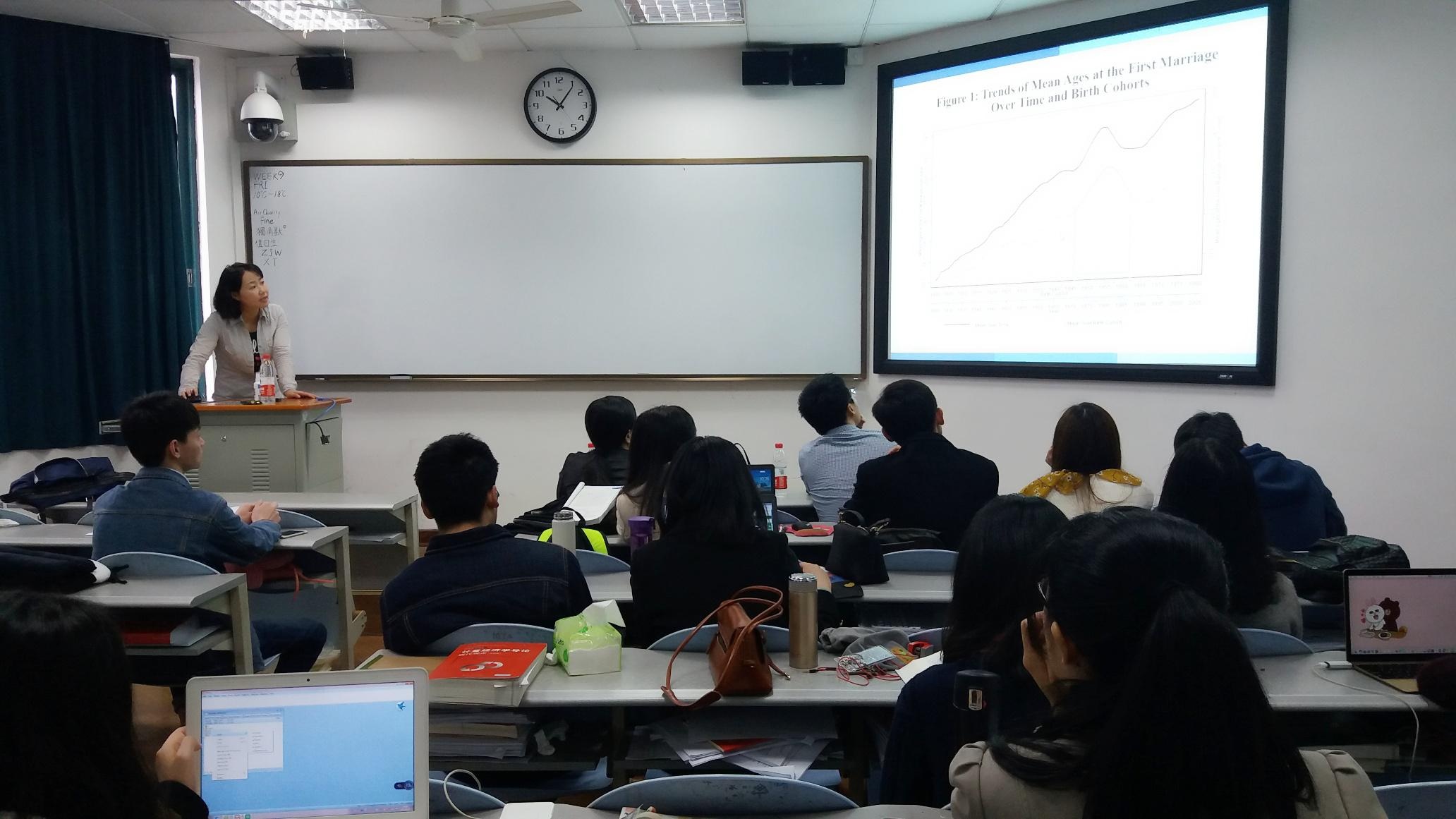 本次研讨会研究了受中国文化大革命的影响程度对个人婚姻决策的影响:结婚的时间以及拒绝婚姻决策。多个国家人口数据库的一致性证据表明接触文化大革命的程度使得个人结婚年龄平均推迟1.2-2年并且使得更多的人选择单身。研究也表明,历史事件的异质性影响人口。并且女性、城市居民、底层社会人民、遭受更多干扰以及在青少年时期遭受更多干扰的人群显示出更明显的婚姻推迟现象。这些研究发现适用于不同的策略认定,不同的模型以及不同的数据库资源。李雪老师所授内容井井有条,深入浅出,老师与同学们也对该问题进行了积极地探讨。