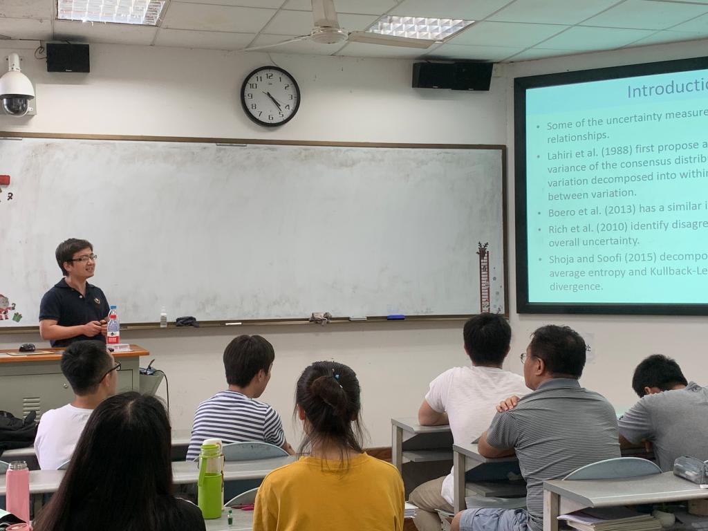 会上,王无为老师详细阐述了其研究内容,并得出相关结论。他指出,研究通过将广义β分布和三角分布应用于SPF(专业预测员调查)直方图中,利用信息框架估计预测的不确定性和不和谐,并与矩估计进行比较。发现除了在潜在密度明显偏离正常值的情况下,这两种方法都可以产生类似的结果。尽管Shannon更多的包含了预测密度的不同方面,但他发现SPF预测在很大程度上是由密度的变化所驱动的。通过利用Jenson-Shannon Information对事前的“news”或“uncertainty shocks”进行实时测量,发现这种“news”与预测手段和反周期的修正密切相关,增加了不确定性。最后利用标准向量自回归分析,证实了不确定性对经济的负面影响。会上,王无为老师耐心详细地解答老师和同学们提出的疑惑,在座的同学们一边认真听着讲解一边做笔记,气氛颇为活跃。